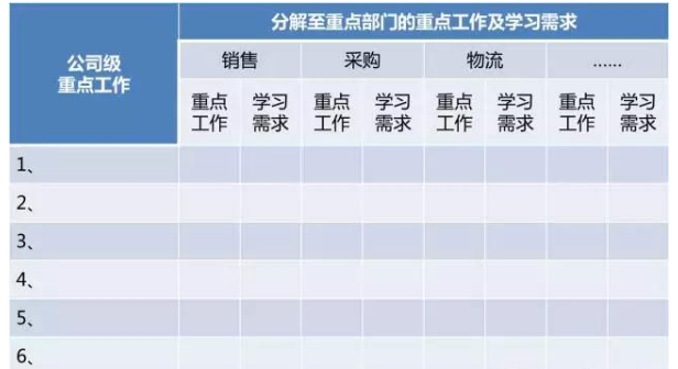基于表2的分解,需要從公司多個戰(zhàn)略重點舉措分解至各相關部門,形成各相關部門的工作要求,而這些工作要求就會形成具體的培訓(學習)需求。所以經(jīng)過層層分解,應該最后形成一張對應到各部門的戰(zhàn)略級學習需求表。