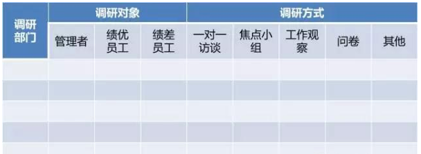表2、3、4都需要經(jīng)過調(diào)研完成,而不是閉門造車紙上談兵。尤其是表4需要深入到公司的各部門去挖掘各崗位的具體培訓需求。而挖掘這些需求有訪談、焦點小組、問卷、工作觀察、流程穿越、對標、二手資料研究等多種方法。需要針對性的結合使用,我們建議多采取一對一訪談的方式。