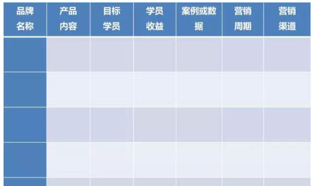首先,要有品牌意識,為每個項目取一個好聽的名字;其次確定每一個品牌的目標定位和學員價值,過往有哪些案例或數(shù)據(jù)可以論證這些收益;然后確定具體的營銷渠道和周期。