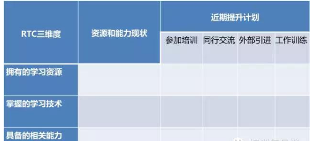 在《培訓進化論:從培訓專家到學習設計師》一書里,列出了培訓人的RTC模型,包括開展培訓工作所需要掌握的資源(Resource)、需要掌握的學習技術(Technology)和個人能力(Capability)。